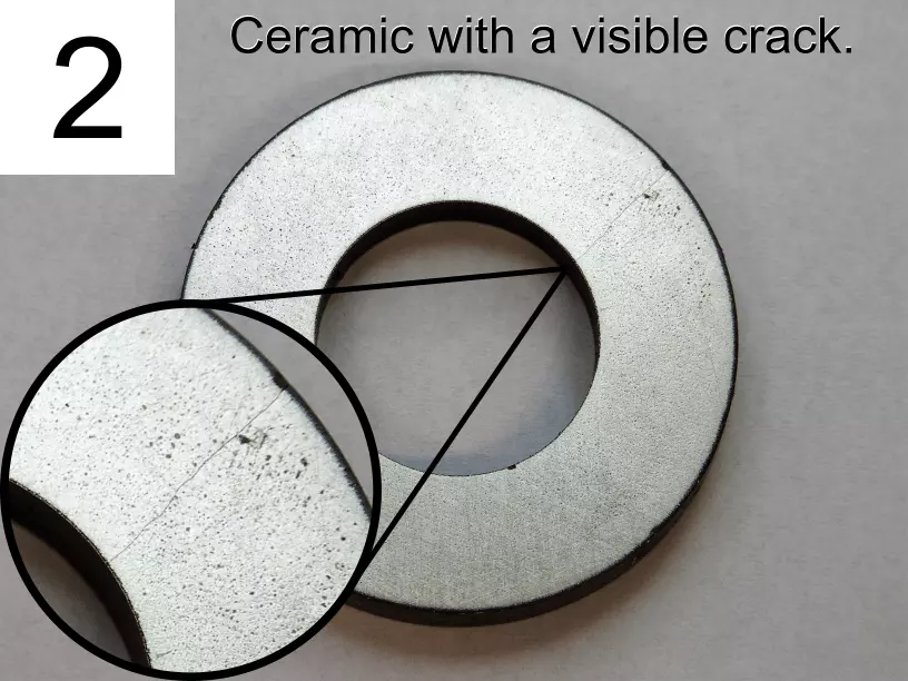 New ceramic with internal crack | | This new ceramic was not approved because multiple additional resonances were detected. The existence of crack was confirmed by the non-destructive ultrasonic testing for the detection of discontinuities. |