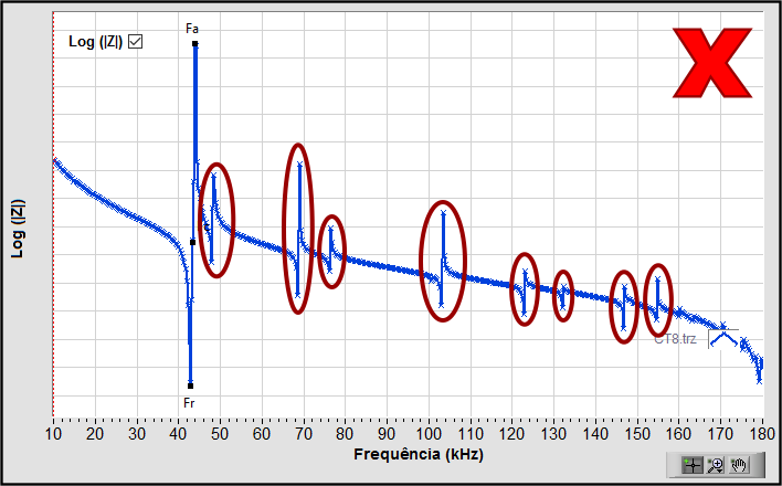 The presence of cracks allows the occurrence of additional vibration and resonance modes, which are detectable by employing the TRZ® Analyzer and Software. Figure 5 and 6 present the impedance spectroscopies (impedance module as a function of frequency/curve |Z(f)|) of two similar piezoelectric ceramics, being one of them intact (Figure 5) and the other cracked (Figure 6).